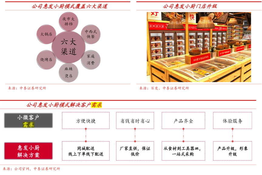經(jīng)典案例:根據(jù)公司官網(wǎng)、中泰證券研究所等綜合資訊表明,“惠發(fā)小廚”是惠發(fā)食品公司 2018 年開(kāi)始嘗試的一種業(yè)務(wù)模式,通過(guò)開(kāi)設(shè)食材(火鍋燒烤麻辣燙 等)一站式采購(gòu)連鎖超市,包含 600 多種食材,每一種均由廠家直供,解決火鍋料產(chǎn)品采購(gòu)品類(lèi)眾多、費(fèi)時(shí)費(fèi)力的現(xiàn)狀,滿(mǎn)足消費(fèi)者一站式低價(jià)購(gòu)齊需求,其本質(zhì)上是一種一站式食材服務(wù)體系。惠發(fā)小廚覆蓋六大渠道,引爆火鍋店、燒烤店、麻辣燙店、中西式快餐、夜市大排檔以及家庭消費(fèi)等。