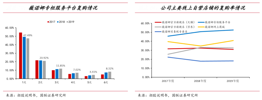 經典案例:根據招股說明書、國聯證券研究所等綜合資訊表明,薇諾娜專柜服務平臺客戶的購買頻次在 2 次及以上的客戶數量占比較高,2017- 2019 年逐年提升,分別為 45.61%、50.70%、52.51%。其客單價較高,主要集中于 1,001-20,000 元區間內,而其線上自營店鋪用戶在快速增長的同時,復購率保持 30%左右。