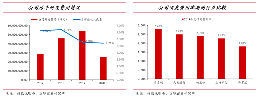 經典案例:根據招股說明書、國聯證券研究所等綜合資訊表明,截至 2020 年上半年,貝泰妮擁有境內有效專利46 項, 并掌握 11 項核心技術,在利用馬齒莧、青刺果、滇山茶等高原特色植物進行植物提取物的有效成分制備,以及生產含有高原特色植物活性成分的敏感肌膚護理產品方面具有較強的技術優勢。2017-2019 年其研發費用的年復合增速為 37%,2019 年研發費用率為 2.78%, 高于同行業其他可比上市公司。