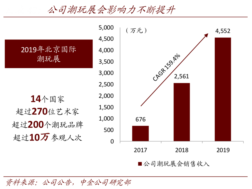 經典案例:根據公司公告、中金公司研究部等綜合資訊表明,2017年后泡泡瑪特公司每年在北京、上海各開辦一次國際潮玩展(除 2020 年受新冠 疫情影響外),展會規模及影響力不斷擴大,其已成為中國最大潮流玩具展,成為合作的大平臺。2019年北京國際潮玩展吸引來自 14 個國家超過 270 名藝術家,參觀人次超過 10 萬。