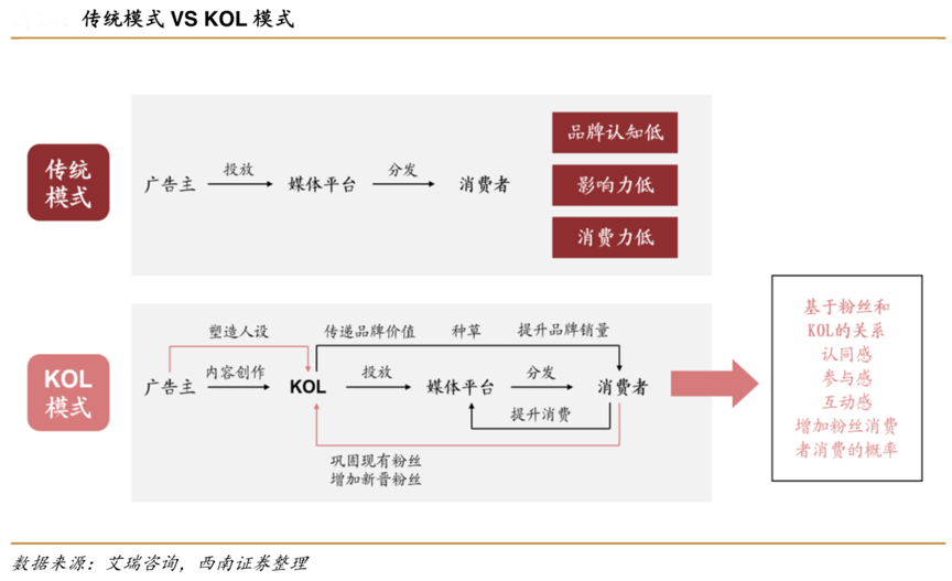 經典案例:根據艾瑞咨詢、西南證券等綜合資訊表明,KOL 模式下,廣告主 通過 KOL 投放廣告,精準鏈接品牌與消費者,有效利用 KOL 自身的號召力、影響力和粉絲生態圈,基于粉絲和 KOL 之間的認同感、參與感、互動感來增加粉絲消費者消費的概率,同時也加強了品牌在粉絲群體中的知名度和影響力。