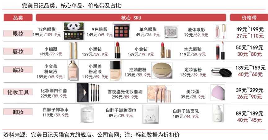 經典案例:根據完美日記天貓官方旗艦店、公司官網、中信證券研究部等綜合資訊表明,隨著彩妝教育的深入和短視頻的普及,眼妝重要性提升,完美日記眼妝推出5大系列,尤其是眼影,通過 IP 聯名、特色包裝和顏色組合設計,完美動物眼影上線以來銷量突破 300 萬件;2019A/2020Q1-3,眼妝營業收入分別約為 9.3/8.4 億元,占比分別為 31.3%/32.0%。