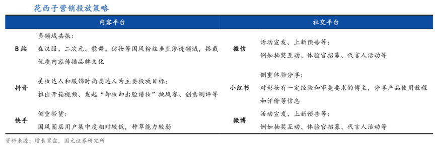 經典案例:根據增長黑盒、國元證券研究所等綜合資訊表明,花西子根據不同平臺特色,匹配適合的營銷投放策略。例如,B 站中品牌首先針對核心國風垂直圈層精 準投放二次元、仿妝、華服展示等,然后逐漸從國粉圈向外破圈傳播;抖音方面,花西子一方面投放開屏廣告塑造品牌形象,另一方面主要投放美妝和服飾時尚垂類達人,并推出開箱視頻、發起“卸妝卸出臉譜妝”挑戰賽等,多維度進行種草等。