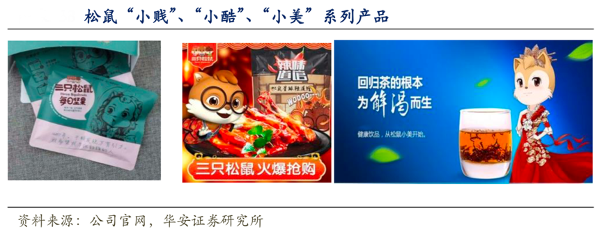 經(jīng)典案例:根據(jù)公司官網(wǎng)、華安證券研究所等綜合資訊表明,三只松鼠以堅(jiān)果起家,松鼠形象和堅(jiān)果品類高度契合,代表著不同系列產(chǎn)品,“小酷”——干果類產(chǎn)品,“小賤”——休閑 零食類產(chǎn)品,“小美”——花果類產(chǎn)品。其以動(dòng)畫為支點(diǎn),持續(xù)性的內(nèi)容輸出幫助建立縱深的產(chǎn)品線。