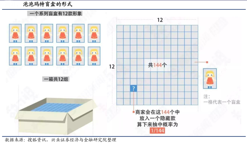 經典案例:根據搜狐資訊、興業證券經濟與金融研究院等綜合資訊表明,盲盒將藝術玩具限量發行、饑餓營銷這一特點放大,并融入了類似日本福袋、扭蛋、 中國 90 年代小浣熊干脆面集卡等售賣形式。以泡泡瑪特的盲盒為例,1 個系列盲盒通常包含 12 種設計和 1 款特殊設計的隱藏款。消費者購買時只能選擇系列,不能選擇具體款式,且隱藏款抽中概率為 1/144。