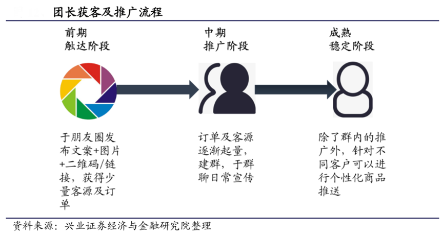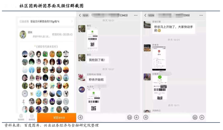 經(jīng)典案例:根據(jù)興業(yè)證券經(jīng)濟(jì)與金融研究院等綜合資訊表明,對(duì)于居住在社區(qū)附近的業(yè)主或者租戶而言,通過熟人網(wǎng)絡(luò)購買、同社區(qū)用戶的相互介紹等,加上群里面團(tuán)長的互動(dòng),加入了更加可靠的社交元素,整體上用戶交互體驗(yàn)更好,信任感更強(qiáng),同時(shí)經(jīng)由社交軟件擴(kuò)散的途徑能夠廣泛觸達(dá)社區(qū)居民。