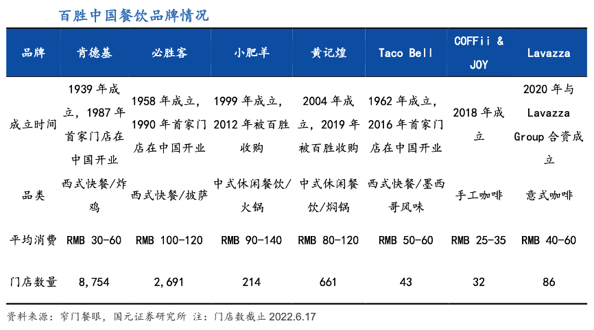 經(jīng)典案例:根據(jù)窄門(mén)餐眼、國(guó)元證券研究所等綜合資訊表明,百勝中國(guó)是國(guó)內(nèi)西式連鎖快餐龍頭,全國(guó)門(mén)店數(shù)超12000 家。目前其旗下餐廳網(wǎng)絡(luò)包括旗艦品牌肯德基和必 勝客,以及小肥羊、黃記煌、COFFii & JOY、塔可貝爾及 Lavazza 等新興品牌,形成涵蓋西式快餐、中餐以及咖啡等多品類(lèi)的品牌矩陣。截止 2022 年 3 月 31 日根據(jù)公司財(cái)報(bào)披露,百勝中國(guó)在國(guó)內(nèi)的門(mén)店數(shù)量共計(jì) 12117 家,覆蓋全國(guó)超過(guò) 1700 家城市。