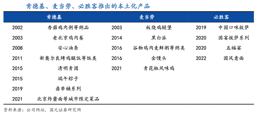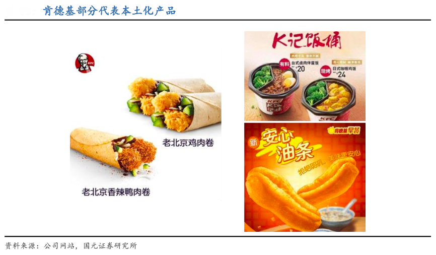 經(jīng)典案例:根據(jù)公司網(wǎng)站、國(guó)元證券研究所等綜合資訊表明,肯德基在保留品牌核心產(chǎn)品的基礎(chǔ)上,通過(guò)調(diào)研掌握國(guó)人飲食文化與飲食習(xí)慣,創(chuàng)新研發(fā)出市場(chǎng)覆蓋率更高,和國(guó)人傳統(tǒng)飲食風(fēng)格接近的新品種。如 2000 年 邀請(qǐng)國(guó)內(nèi)食品營(yíng)養(yǎng)專(zhuān)家成立食品健康委員會(huì),每年推出 30-40 款新品,其中一半以上是具有中餐特色的產(chǎn)品。例如先后在北京地區(qū)推出類(lèi)似北京烤鴨的“老北京雞肉卷”,在上海地區(qū)推出“枸杞南瓜粥”等粥類(lèi),在全國(guó)推出“安心油條”、豆?jié){、K記飯桶等產(chǎn)品。