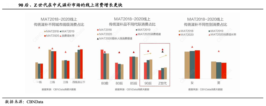 經典案例:根據CBNData、國泰君安證券研究等綜合資訊表明,85后、90后通常能做到堅持不斷,將中式養生食品作為日常食用的健康食品,例如隨身攜帶阿膠糕、紅棗枸杞丸、人參果凍等即食產品,方便隨時食用。據CBNData 發布的《2020 中式養身行業洞察》,90后在中式滋補市場的線上消費增速明顯高于市場整體增速。