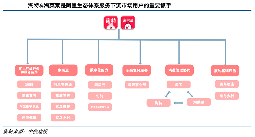 經(jīng)典案例:根據(jù)中信建投等綜合資訊表明,淘菜菜和淘特的能力稟賦有很多相似特征,都是建立在強商品力、履約能力和運營能力的 基礎(chǔ)上,對阿里的供應(yīng)鏈都有協(xié)同和復(fù)用,同時淘特本身也是淘菜菜的供應(yīng)鏈端之一,只不過淘菜菜作為社區(qū) 團購/社區(qū)電商模式,在終端履約環(huán)節(jié)增加了一個圍繞社區(qū)自提點展開的渠道能力。