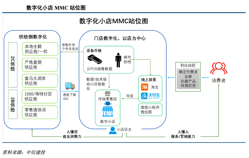 經(jīng)典案例:根據(jù)中信建投等綜合資訊表明,相比于美團的線下地推以及多多買菜的社交裂變,阿里依托零售通背后下沉市場的 100 多萬實體門店資源,一方面將門店數(shù)字化,通過淘寶、支付寶完成線上獲客,另一方面其在選品和供應(yīng)鏈上更加面向下沉市場,固定經(jīng)營場所增加服務(wù)確定性,穩(wěn)定的鄰里關(guān)系提供個性化分層服務(wù),數(shù)字感知設(shè)備入場能讓小店聚攏規(guī)模化需求,反哺生產(chǎn)端,有利于建立基于下沉市場小店模式的社區(qū)團購。