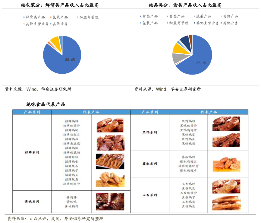 經典案例:根據wind、大眾點評、美團、華安證券研究所等綜合資訊表明,絕味食品主要從事休閑鹵制食品的開發、生產與銷售,根據品類劃分,涵蓋肉制品、蔬菜、水產品、豆制品等,其中以鴨脖為代表的禽肉制品為公司貢獻最大比例的銷售收入;根據口味劃分,公司產品可細分為“招牌系列”“黑鴨系列”“醬鴨系列”“五香系列”“藤椒系列”等不同口 味,可滿足消費者的不同偏好。