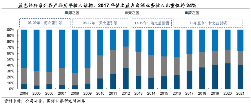 經典案例:根據公司公告、國海證券研究所等綜合資訊表明,2003年洋河公司主推的“海之藍”精準卡位當時市場上幾無競品的 138 元價格帶,結合品牌以及渠道端的創新,海之藍迅速完成泛全國化,2004-2006 年收入復合增速約 00%,成為百元價格帶最大的單品,2017年海/天系列合計銷售達百億,公司 300 元以下產品收入占比超75%。
