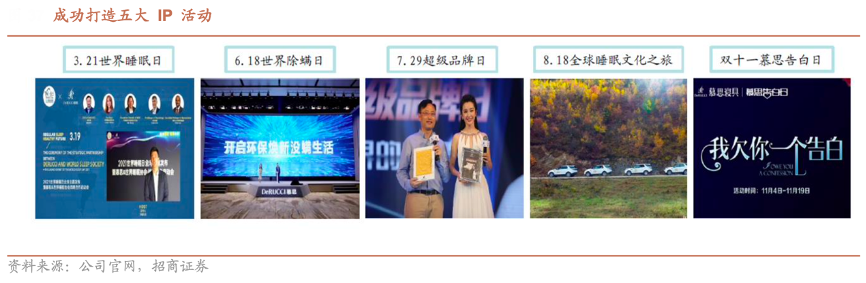 經典案例:根據公司官網、招商證券等綜合資訊表明,慕思目前已成功打造五大 IP 活動(3.21 世界 睡眠日、6.18 世界除螨日、7.29 超級品牌日、8.18 慕思全球睡眠文化之旅、雙 11 慕思告白日)傳播健康睡眠文化。其中“3.21 世界睡眠日”、“6.18 世界除螨日”、“8.18 慕思全球睡眠文化之旅”等倡議活動已成為影響深遠的行業(yè)盛事,通過一系列內容營銷的策劃和執(zhí)行,不僅為公司和渠道商帶來了業(yè)績增長,也在全國范圍內形成了良好的品牌宣傳效果。