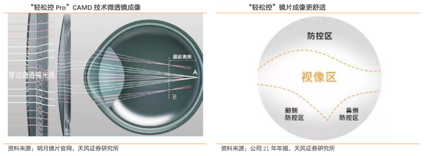 經典案例:根據明月鏡片官網、公司21年年報、天風證券研究所等綜合資訊表明,明月鏡片公司于2021年 6 月推出一代產品折射率 1.60 的“輕松控”,12 月推出折射率 1.67 的二代產品“輕松控 Pro”,全面進軍近視防控鏡片市場,分別采用周邊離焦眼軸控制技術(C.A.R.D)及多點 近視離焦眼軸控制技術(C.A.M.D),通過膜前離焦抑制眼軸過快增長,有效延緩近視加深。