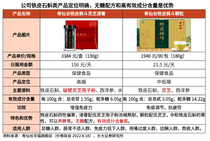 與鐵皮石斛類頭部競(jìng)品相比,壽仙谷公司的鐵皮楓斗顆粒采用無糖配方,其有效成分含量明 顯更高,性價(jià)比突出,而鐵皮楓斗靈芝浸膏采用了破壁靈芝孢子粉和西洋參配伍,相比競(jìng)品成分更為高端和豐富,凸顯產(chǎn)品特色。