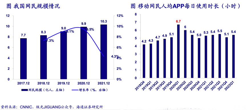 經典案例:根據CNNIC、極光JIGUANG公眾號、海通證券研究所等綜合資訊表明,截至2021年12月底,我國網民數量達10.3億,根據極光大數據,22Q1中國移動網民人均APP每日使用時長穩定于5.4小時,移動互聯網已經進入存量競爭時代。