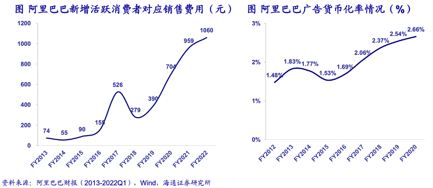 經典案例:根據阿里巴巴財報(2013-2022Q1)、wind、海通證券研究所等綜合資訊表明,隨著流量見頂、競爭加劇,平臺獲客成本水漲船高,商家數和SKU數量的提升,信息匹配和交易撮合的成本也開始提升,阿里巴巴廣告貨幣化率在2015財年見底后逐步提升,也反映了商家為了產生GMV而需要付出的廣告營銷成本在逐步提升。