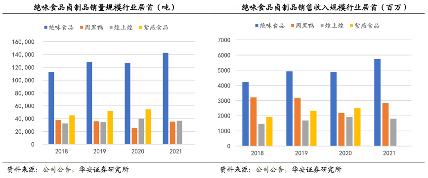 經典案例:根據wind、大眾點評、美團、華安證券研究所等綜合資訊表明,絕味食品主要從事休閑鹵制食品的開發、生產與銷售,根據包裝劃分,其可分為鮮貨類產品以及包裝類產品,鮮貨類產品收入占比 85%以上;根據品類劃分,涵蓋肉制品、蔬菜、水產品、豆制品等,其中以鴨脖為代表的禽肉制品為公司貢獻最大比例的銷售收入。