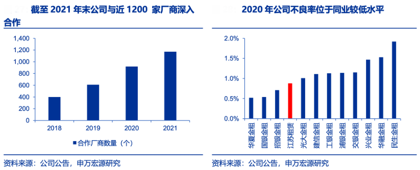 經典案例:根據公司公告、申萬宏源研究等綜合資訊表明,江蘇租賃公司融資租賃資產不良率較為穩定,整體看,不良率從 2018 年的 0.79%上升至 2021 的 0.96%,但仍保持在低于1%水平線;同時撥備覆蓋率大幅提升,從2016 年 375%提高至 2021 年432%,彰顯了持續穩健的資產質量和審慎的風控理念。