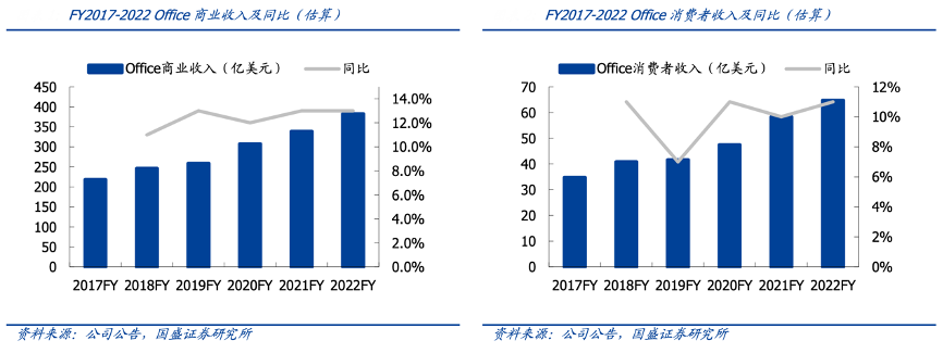 經(jīng)典案例:根據(jù)公司公告、國盛證券研究所等綜合資訊表明,MS Office 已有成熟驗(yàn)證,B 端收入占比86%。從增速表現(xiàn)而言,B 端收入增速近 5 年來亦持續(xù)優(yōu)于 C 端。FY2022,Office 商業(yè)收入同比增長約 13%,其中Office 365 收入同比增長18%;Office 消費(fèi)者收入同比增長約11%,其中 Microsoft 365 訂閱數(shù)達(dá)到 5970 萬人,同比增長15%。