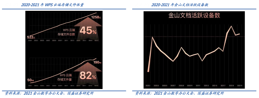 經(jīng)典案例:根據(jù)2021年金山數(shù)字辦公大會(huì)、國盛證券研究所等綜合資訊表明,云與協(xié)作從“嘗新”到“常用”,WPS 完成從工具到服務(wù)的轉(zhuǎn)變。2021年8月起,金山文檔的月活躍用戶數(shù)超過了去年2月份時(shí)的峰值 2.39 億,達(dá)到了一個(gè)新的增長起點(diǎn),表明用戶已經(jīng)逐漸習(xí)慣在日常工作中,大量使用協(xié)同文檔來解決協(xié)作的問題。