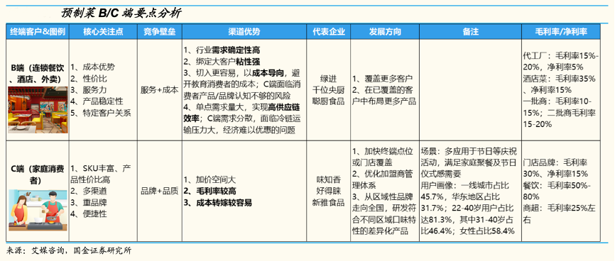 經(jīng)典案例:根據(jù)艾媒咨詢、國金證券研究所等綜合資訊表明,目前預(yù)制菜領(lǐng)域B端占比約八成,B 端先行發(fā)展起來主因客戶需求較簡單,他們更看重成本因素與供貨穩(wěn)定性,而 C 端直達(dá)消費(fèi)者,對產(chǎn)品品質(zhì)、產(chǎn)品豐富度、企業(yè)品牌力、渠道布局要求苛刻,企業(yè)更難做好;同時(shí)餐企降本增效訴求強(qiáng)烈,對預(yù)制菜需求確定性更強(qiáng),C 端仍面臨外賣等競品壓力。
