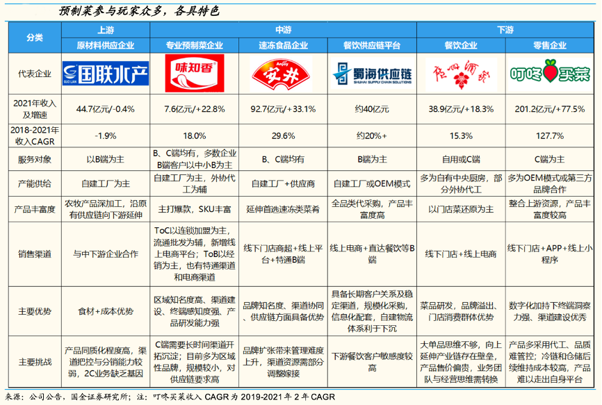 經(jīng)典案例:根據(jù)公司公告、國金證券研究所等綜合資訊表明,短期內(nèi) To B 端的中游餐飲供應(yīng)鏈平臺、上游原材料供應(yīng)企業(yè)優(yōu)勢明顯,主因獲客成本與運(yùn)輸成本因原有業(yè)務(wù)建立的渠道體系存在,新增預(yù)制菜業(yè)務(wù)邊際成本極低,同時(shí)上游原材料供應(yīng)商還具備更強(qiáng)的原材料成本優(yōu)勢。