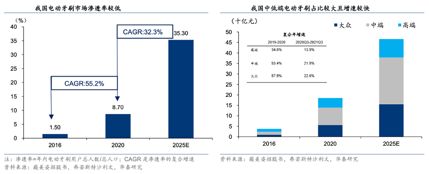 經典案例:根據薇美姿招股書、弗若斯特沙利文、華泰研究等綜合資訊表明,我國電動牙刷滲透率明顯偏低,電動牙刷單位零售價 250 元-600 元的中端電動牙刷的零售額占我國電動牙刷市場最大份額,2020年占比45%。由于我國電動牙刷滲透率較低,單位零售價低于 250 元的大眾市場增長最快,2016 年至 2020 年復合增長率達57.9%。