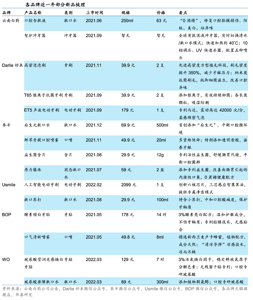 經典案例:根據云南白藥公司公告、Darlie好來微信公眾號、參半微信公眾號、Usmile微信公眾號、BOP微信公眾號、各品牌天貓旗艦店、華泰研究等綜合資訊表明,成熟品牌探索新興領域,新銳品牌加速創新,云南白藥和好來化工(黑人牙膏母公司)作為傳統口腔護理企業的代表,都以其牙膏品牌廣為人知,如今它們也開始涉足更多新興品類,從淘寶旗艦店銷售品類來看,它們都上新了包括漱口水、電動牙刷、牙線在內的口腔護理產品。