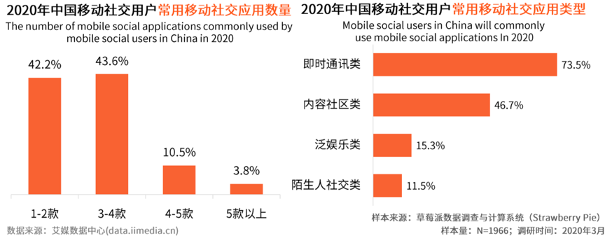 “即時性社交溝通工具”正成為品牌移動社交新零售發展的關鍵媒介,也日益成為零售交易的重要載體。據艾媒數據中心、草莓派數據調查與計算系統等綜合資訊表明,在常用移動社交應用數量調研中,43.6%的受訪用戶使用3-4款應用,微信、QQ為代表的即時通訊類應用占到絕大比重,社交方式仍以熟人社交為主,常用移動社交應用類型多以即時通訊類(73.5%)、內容社區類(46.7%)、泛娛樂類(15.3%)等為主。