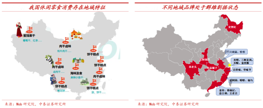根據Mob研究院、中泰證券研究所等綜合資訊表明,我國休閑零食品消費存在地域性特征,地域食品品牌尚處于“群雄割據”的狀態,東部沿海地區以餅干糕點及肉類鹵味為主,西北地區以蜜餞果干類為主,長三角與珠三角是休閑食品品牌聚集地,而在其他地區亦分布有當地品牌,因此線下市格局較為散亂,行業正處于區域龍頭品牌群雄割據、行業領先品牌走向全國的分化成長階段。