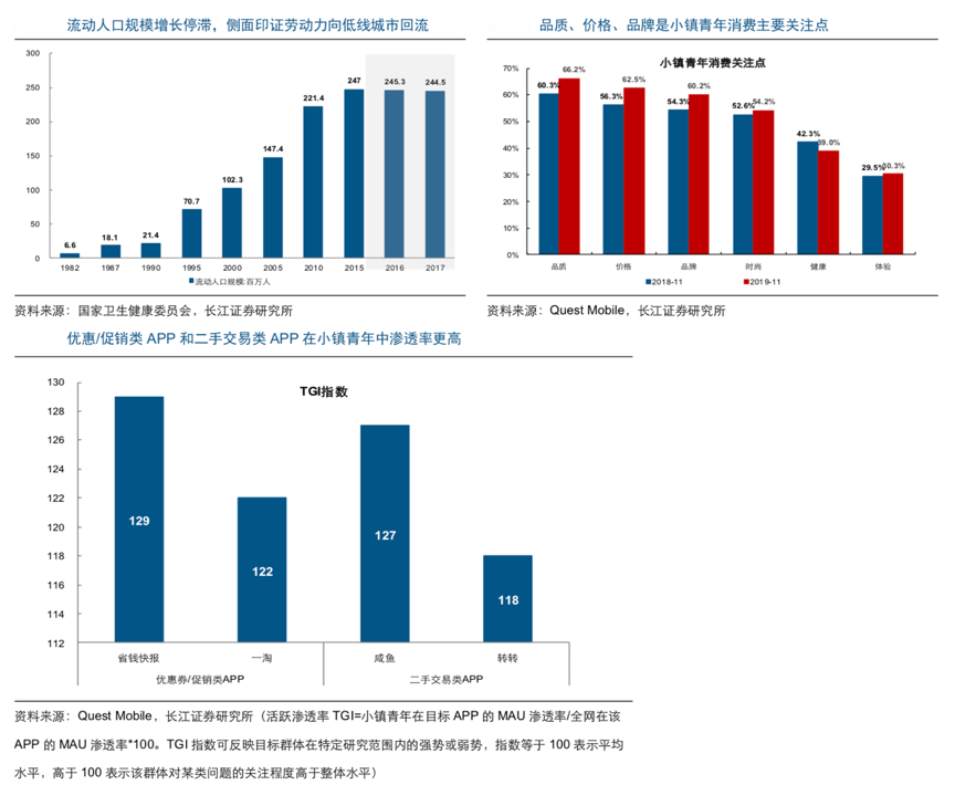 經典現象:根據國家衛生健康委員會、長江證券研究所、Quest Mobile等綜合資訊表明,互聯網帶來的信息扁平化、網購滲透率的持續提升進一步為打破地域限制、追求消費趨同提供了可能,在收入絕對金額相對較低的基礎上,“品質、價格、品牌”依次是小鎮青年消費主要關注點,而優惠券/促銷類 APP 活躍滲透率較高則側面反映了小鎮青年具備較高價格敏感度,二手交易旺盛或表明其具備較高性價比的追求。