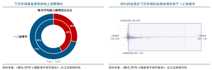 經典現象:根據《騰訊2019小鎮青年研究報告》、長江證券研究所等綜合資訊表明,從品類滲透率來看,約有90%的品類在下沉市場滲透率低于城市,且滲 透率增長空間較大的品類主要集中在食品飲料、個護家清、家居裝飾、本地生活和服裝服飾等行業。以優勢品類帶動企業業績增長,對企業來說更具有可行性。