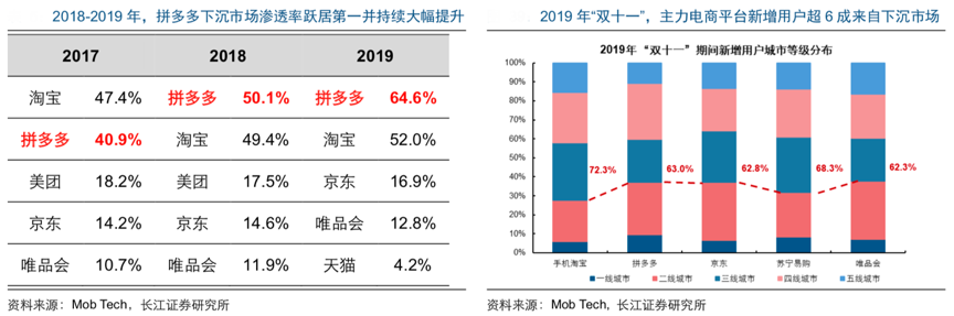 經典現象:根據Mob Tech、長江證券研究所等綜合資訊表明,隨著各大電商平臺 C2M 戰略的持續推進,入駐廠商數量迅速擴張,2020 年 3 月上線的淘寶特價版已迅速躍居為產業帶商家的最大平臺。而 C2M 戰略效果亦逐步顯現,拼多多、阿里在下沉市場滲透率持續提升,拼多多成為下沉用戶喜愛的電商 APP;2019 年“雙十一”期間,主力電商平臺新增用戶均超6成來自下沉市場。