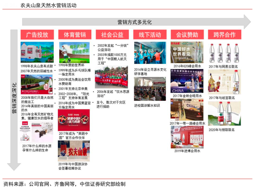 經典案例:根據公司官網、中信證券研究部等綜合資訊表明,農夫山泉營銷方式逐步多元化,從早期主要依靠電視投放&體育營銷,發展出線下活動、贊助會議、跨界合作等更多方式。公司在水源地周邊共建設有水情教育基地13座,累積接待量已達350萬人。