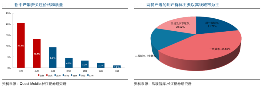 經典案例:根據Quest Mobile、長江證券研究所等綜合資訊表明,新中產消費關注點主要在于“價格及品質”,而對品牌、時尚等方面的關注度相對較低。而以網易嚴選、小米有品等為代表的好用不貴的“精品電商”開始在一線城市快速滲透,易觀數據顯示網易嚴選用戶構成中60%以上處于超一線及一線城市,而其三線及以下城市占比僅為20%。