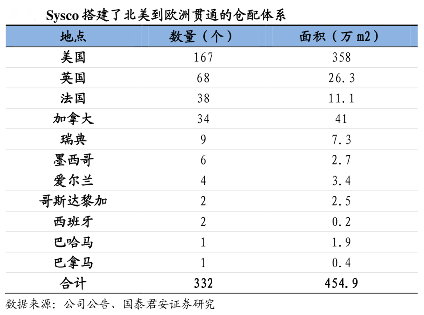 經典案例:根據公司公告、國泰君安證券研究等綜合資訊表明,Sysco自建倉儲物流設施,打造貫通歐洲、北美的供應鏈體系,服務客戶數超 60 萬。Sysco 擁有面積達 4896 萬平方英尺的 332 個配送中心,1.4 萬輛 物流運輸車輛。