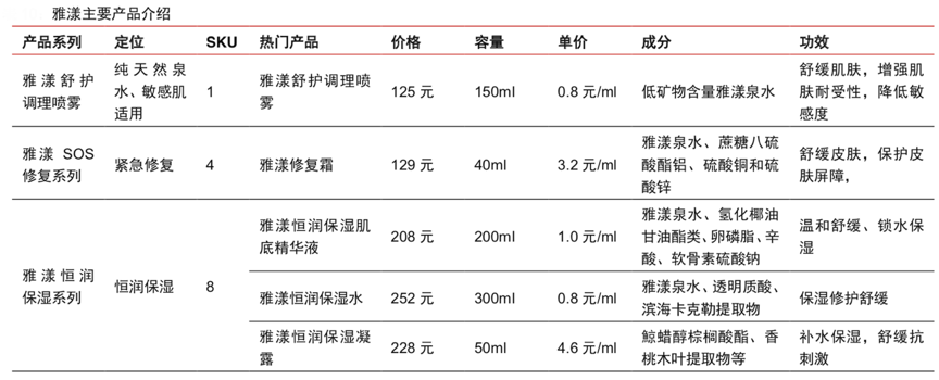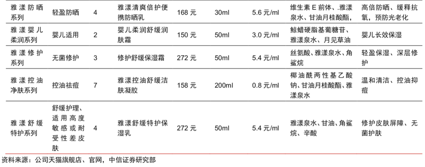 經(jīng)典案例:根據(jù)公司天貓旗艦店、官網(wǎng)和中信證券研究部等綜合資訊表明,雅漾產(chǎn)品主要依托雅漾溫泉水,配方不含防腐劑、香料,致敏性較低。產(chǎn)品的生產(chǎn)及包裝嚴(yán)格按照 GMP 標(biāo)準(zhǔn),是市場(chǎng)上首個(gè)采用無(wú)菌技術(shù)的皮膚醫(yī)學(xué)護(hù)膚品系列。2009年其包裝技術(shù)再次升級(jí),推出創(chuàng)新包裝密封技術(shù) D.E.F.I(Dispositif Exclusif Formule Intacte,無(wú)菌艙包裝,即內(nèi)容物只出不進(jìn)),即使多次使用也可以保護(hù)無(wú)菌配方。