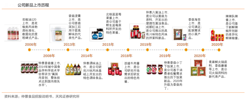 經典案例:根據仲景食品招股說明書、天風證券研究所等綜合資訊表明,自成立以來,仲景食品就不斷推陳出新,2006 年,花椒油 120 上市;2008 年,仲景香菇醬上市;2018-2019 年,其陸續推出牛肉醬、香菇小丁、藍莓醬、成都紅油等調味食品,市場反響良好,形成了新的利潤增長點。