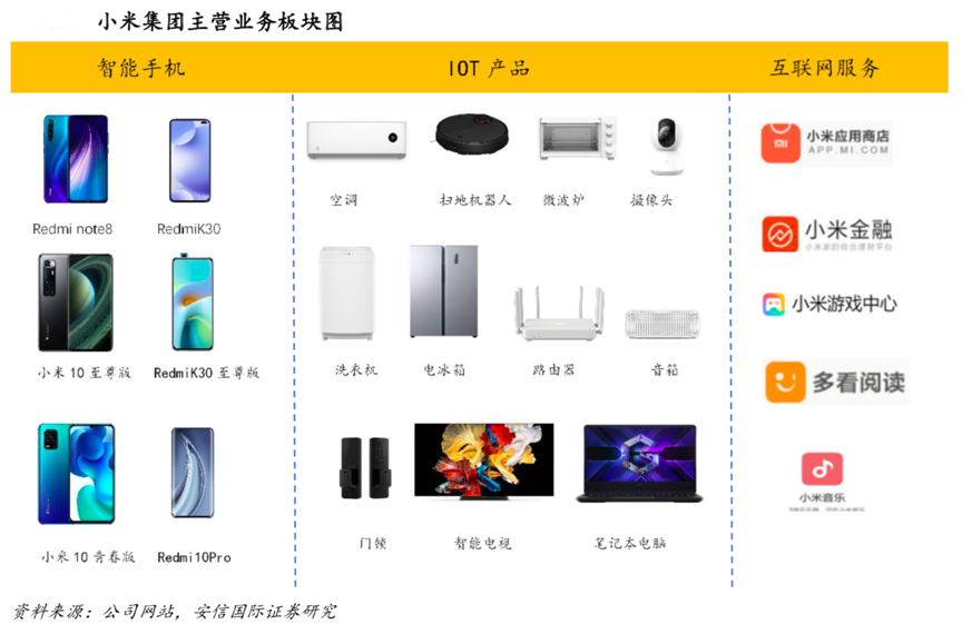 經典案例:根據公司網站、安信國際證券研究等綜合資訊表明,小米已經形成了“全生態鏈布局”,在智能手機領域,公司分出了小米與紅米兩大主品牌以及其他子品牌,小米致力于高端市場,而紅米則主攻極致性價比;在IOT 產品領域,公司通過智能電視、可穿戴設備等在智能生活領域扮演控制中樞角色從而連通公司產業鏈其他的產品,進而構建智能生活未來;在互聯網服務方向,公司的廣告服務以及線上游戲以及小米金融的金融服務等增值服務是其收入的主要構成部分。