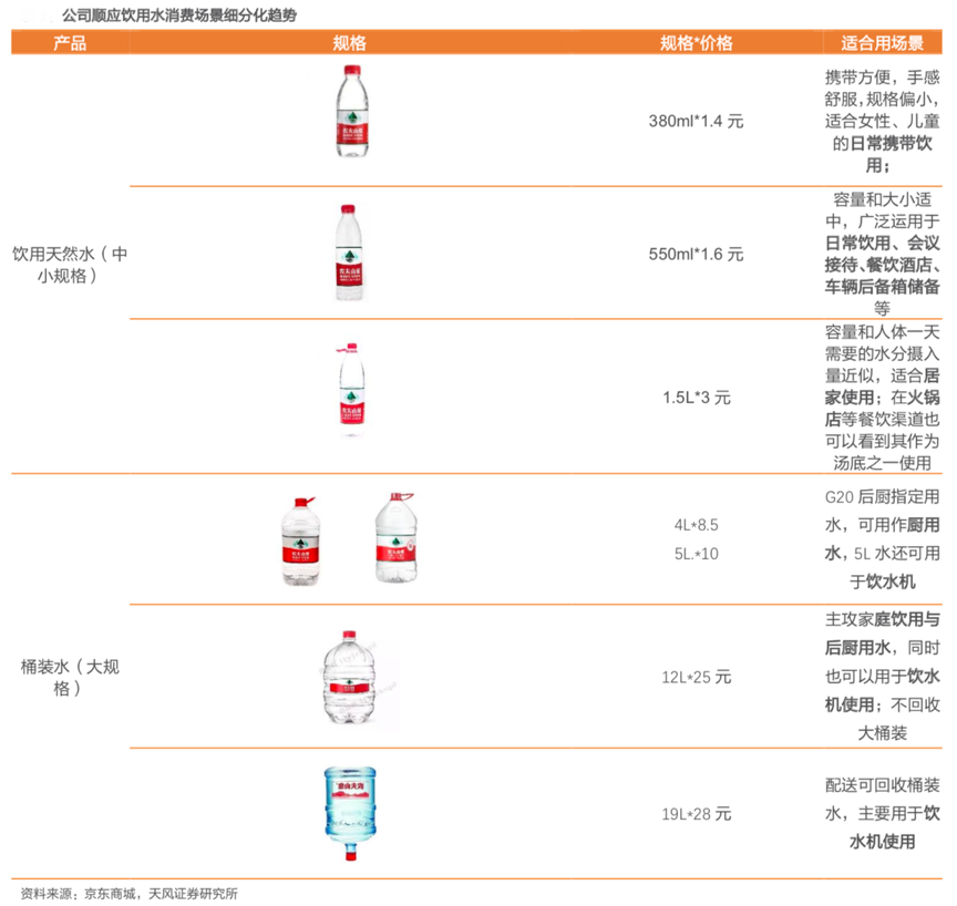 經(jīng)典案例:根據(jù)京東商城、天風證券研究所等綜合資訊表明,隨著居民健康意識的逐漸增強以及對高生活品質(zhì)的追求,廚用水、日飲水等家庭場景用水質(zhì)量得到越來越多消費者的關注;農(nóng)夫山泉順應飲用水消費場景細分化趨勢,產(chǎn)品涵蓋了各種380ml、550ml、1500ml、4L、5L、12L、19L等多種規(guī)格,家用消費、商用消費及小規(guī)格攜帶消費等多種消費場景基本已經(jīng)涵蓋,“產(chǎn)品全消費場景價值”突出。
