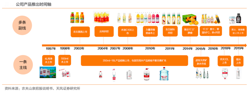 經(jīng)典案例:根據(jù)農(nóng)夫山泉招股說明書、天風證券研究所等綜合資訊表明,2012 年-2019年,農(nóng)夫山泉連續(xù)八年保持中國包裝飲用水市場占有率第一,以2019 年零售額計,農(nóng)夫山泉在茶飲料、功能飲料及果汁飲料的市場份額均居中國市場前三位,其已經(jīng)形成多元化產(chǎn)品矩陣,除飲用水外,已經(jīng)布局即飲茶、功能飲料、果汁、植物蛋白、咖啡類等多品類成長矩陣。