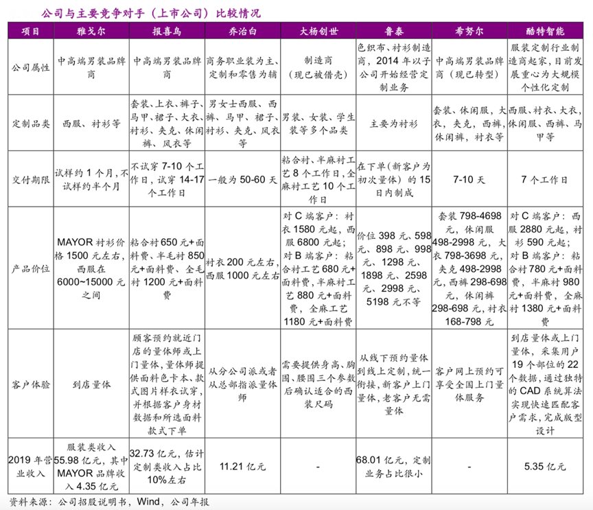經典案例:根據公司招股說明書、wind、公司年報、光大證券研究等綜合資訊表明,一些成衣品牌順應市場需求將業務延伸到定制服裝產品,推出了定制系列或定制子品牌(如報喜鳥、雅戈爾等),同時行業內已著手進行服裝大規模個性化定制業務,并取得了一定成績的上市公司(或曾經上市)主要有雅戈爾、報喜鳥、喬治白、大楊創世、魯泰紡織以及希努爾等。