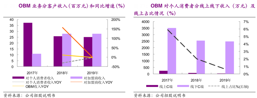 典型現象:根據公司招股說明書、光大證券研究等綜合資訊表明,酷特智能公司 OBM 業務可按客戶分為個人消費者和加盟商,2019年 OBM 模式下對個人消費者和對加盟商的收入分別為 2495 萬元、2794萬元,規模基本相當、分別占 OBM 業務收入比例為 47%、53%。近三年來公司直營 比例下降(對個人消費者收入持續下滑),加盟占比則持續提升,2017~2019 年末公司直營店分別為 16 家、8 家、5 家呈逐步 收縮態勢,2019 年末的 5 家直營店分布于北京、青島(3 家)、即墨。收入分渠道來看,對個人消費者收入絕大多數為線下,線上占比較低、2019 年占對個人消費者收入不到 1%。