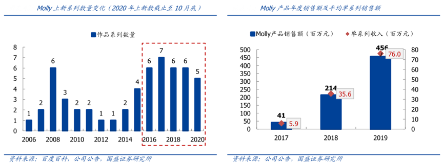經(jīng)典案例:根據(jù)百度百科、公司公告、國(guó)盛證券研究所等綜合資訊表明,Molly 在與泡泡瑪特合作后,上新頻率顯著加快,從上新數(shù)量來(lái)看,Molly 在與泡泡 瑪特合作后(16-19 年)每年至少推出 6 個(gè)系列超過(guò) 70 個(gè)產(chǎn)品形象。收入端來(lái)看,單系列銷(xiāo)售收入持續(xù)上升。2017-2019 年 Molly 收入分別為 0.41、2.14、 4.56 億元, Molly 的商業(yè)化潛力在泡泡瑪特的加持之下進(jìn)一步激發(fā),也是公司將小眾 IP 打 造成大眾 IP 能力的有效驗(yàn)證。