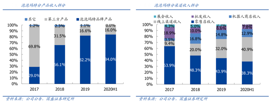 經(jīng)典案例:根據(jù)公司公告、國(guó)盛證券研究所等綜合資訊表明,2019 年,泡泡瑪特品牌產(chǎn)品、第三方產(chǎn)品(手辦、拼圖、潮玩等)、其他業(yè)務(wù)(展會(huì)相關(guān)收入)營(yíng)收占比分別為 82.2%、 16.6%、1.1%,其中品牌產(chǎn)品收入占比提升顯著,而分渠 道來(lái)看,零售店為泡泡瑪特最主要的收入來(lái)源,2019 年占比 43.9%,線(xiàn)上渠道收入占比從 2017 年的9.4%提升至 2019 年的 32.0%,線(xiàn)上渠道收入占比進(jìn)一步增長(zhǎng)成為主要收入來(lái)源(40.9%)。