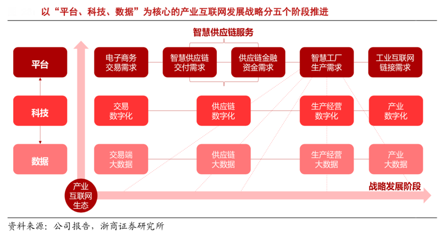 經典案例:根據公司報告、浙商證券研究所等綜合資訊表明,國聯股份確定了以“平臺、科技、數據”為核心的產業互聯網發展戰略,將按五個階段依次推進戰略:1工業電子商務階段,將滿足企業客戶的交易需求;2智慧供應鏈階段,將滿足企業客戶的交付需求;3供應鏈金融階段,將滿足企業客 戶的資金需求;4智慧工廠解決方案階段,將滿足企業客戶的生產需求;5工業互聯網階段,將上下游共構鏈接,形成產業數字化閉環。