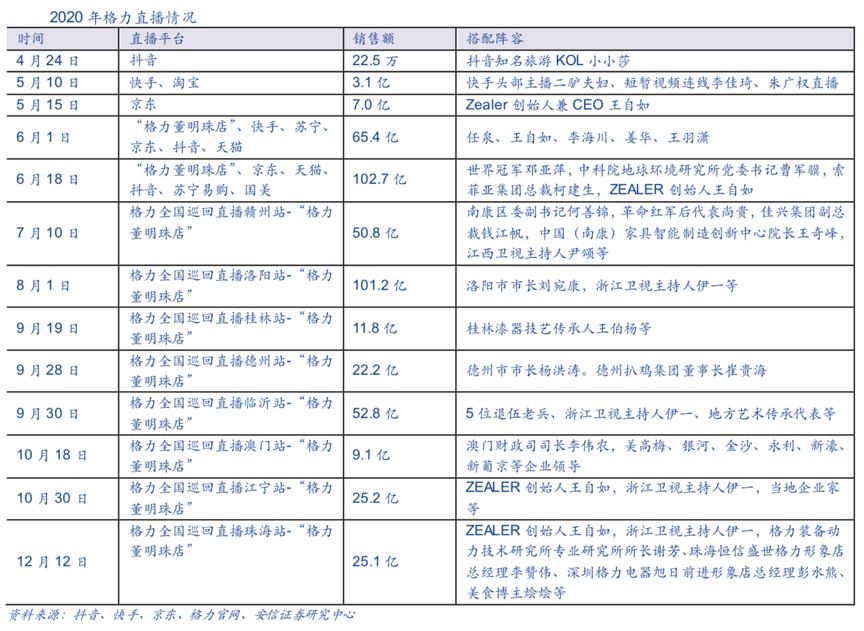 經典案例:根據抖音、快手、京東、格力官網、安信證券研究中心等綜合資訊表明,7 月份以來,格力已開展 8 場全國巡回直播活動,累計銷售額達到 298.2 億元。近期的直播中,“格力董明珠店”不僅面向終端消費者,也向經銷商開放了批貨的窗口,經銷商從直播中下單提貨的型號,一般都是市場暢銷機型。