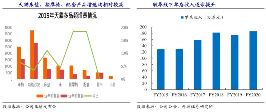經(jīng)典案例:根據(jù)公司業(yè)績(jī)發(fā)布會(huì)、公司公告、開源證券研究所等綜合資訊表明,敏華控股品類拓展主要在于依靠沙發(fā)的前端引流作用,逐步帶動(dòng)床墊、配套等產(chǎn)品銷售,進(jìn)而提升客單值。2019年,其天貓軟體品類中床墊、按摩椅、配套產(chǎn)品增速均相對(duì)較高,而消費(fèi)升級(jí)則主要為伴隨 消費(fèi)者消費(fèi)水平的持續(xù)提升,消費(fèi)者對(duì)于芝華士高價(jià)系列產(chǎn)品的接受度在不斷提高。
